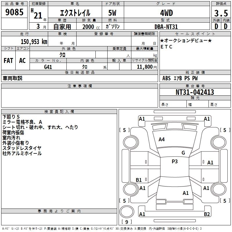 | DRIVING GEAR | DBA-NT31 | MR20DE | Full-time 4WD | CVT | 1997cc | 137ps(101kW)/5200rpm | AИ-92 | 2 425 500 | |