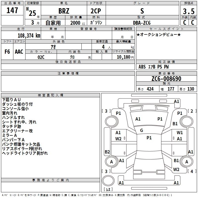 | TS GT PACKAGE | DBA-ZC6 | FA20 | FR | 6AT | 1998cc | 200ps(147kW)/7000rpm | AИ-95 | 4 373 250 | |