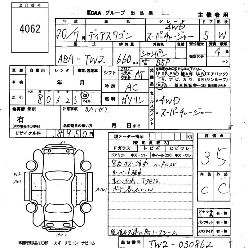 | SUPER CHARGER | ABA-TW2 | EN07 | Full-time 4WD | 3AT | 658cc | 58ps(43kW)/6000rpm | AИ-92 | 1 594 950 | |