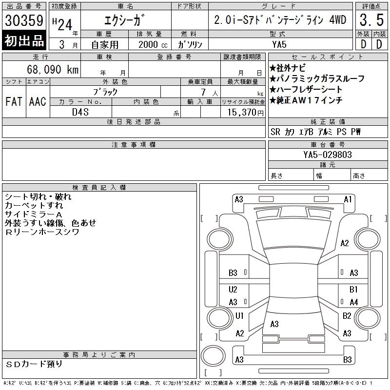 | 2.5I SPEC B EYESIGHT | DBA-YAM | FB25 | Full-time 4WD | CVT | 2498cc | 173ps(127kW)/5600rpm | AИ-92 | 2 782 500 |