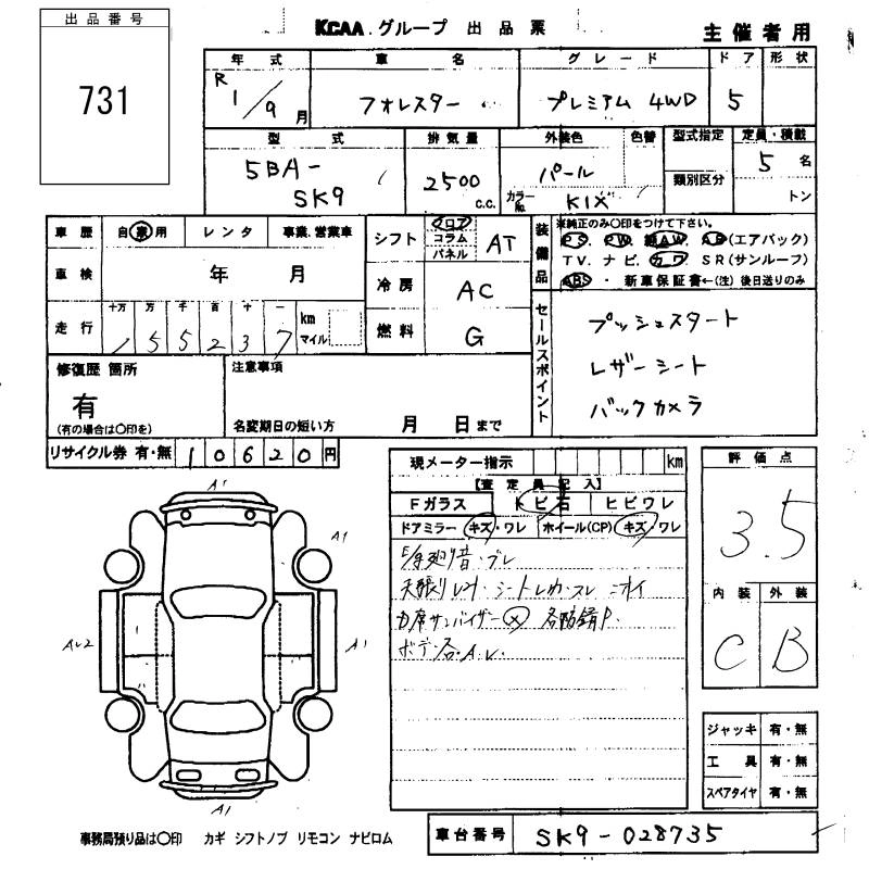 | PREMIUM | 5BA-SK9 | FB25 | Full-time 4WD | CVT | 2498cc | 184ps(136kW)/5800rpm | AИ-92 | 3 024 000 | |