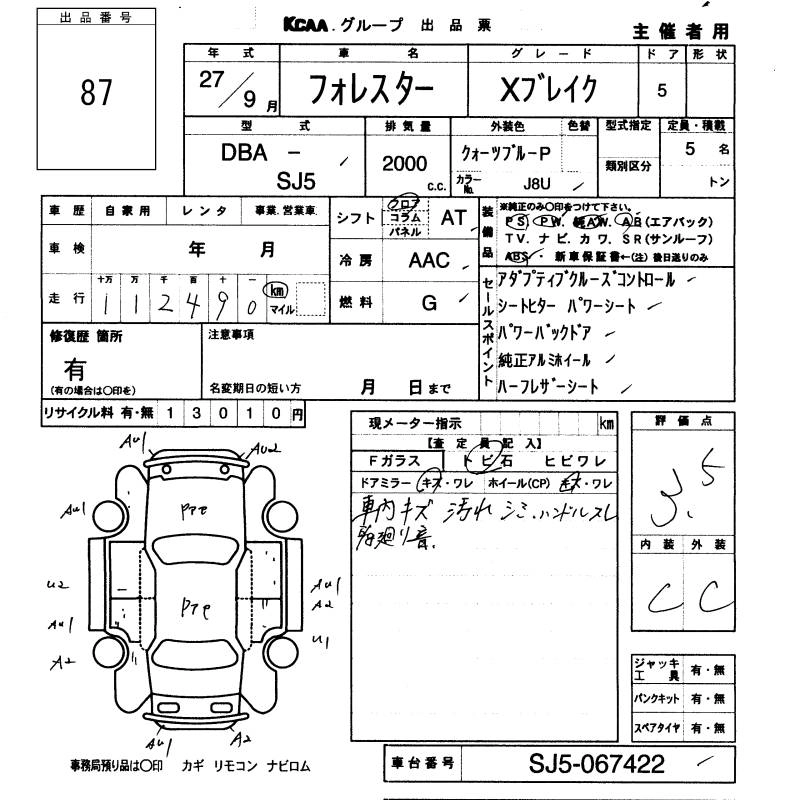 SUBARU FORESTER 2015 г., лот № 87