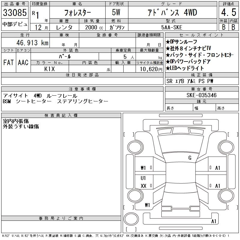 | PREMIUM | 5BA-SK9 | FB25 | Full-time 4WD | CVT | 2498cc | 184ps(136kW)/5800rpm | AИ-92 | 3 080 000 | |