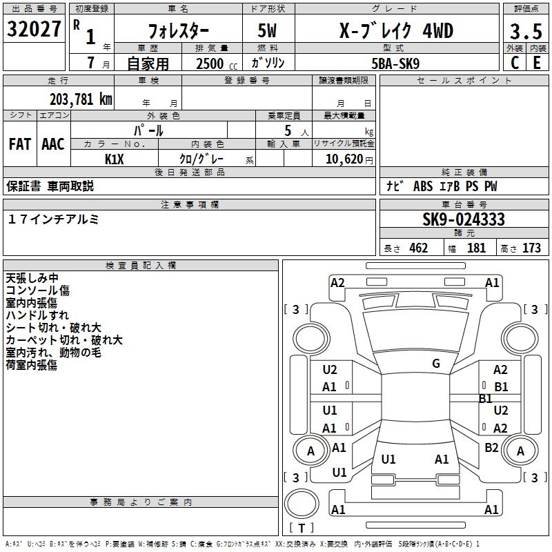 | PREMIUM | 5BA-SK9 | FB25 | Full-time 4WD | CVT | 2498cc | 184ps(136kW)/5800rpm | AИ-92 | 3 024 000 | |