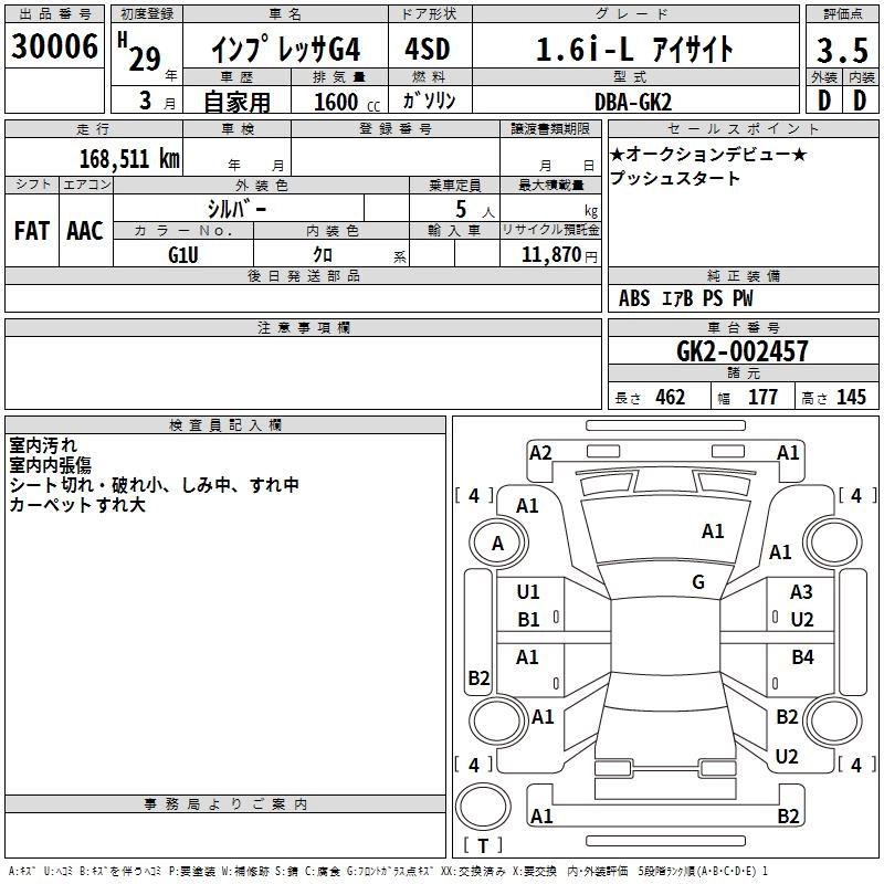 | 2.0I-S EYE SIGHT | DBA-GK6 | FB20 | FF | CVT | 1995cc | 154ps(113kW)/6000rpm | AИ-92 | 2 397 600 | |