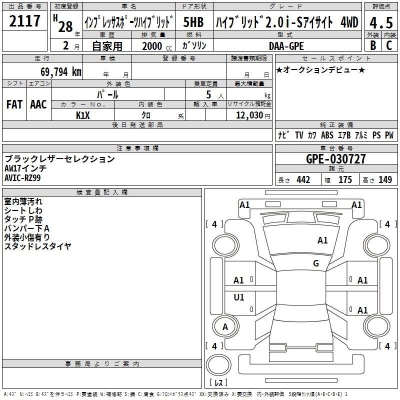 SUBARU IMPREZA SPORT HYBRID 2016 г., лот № 2117
