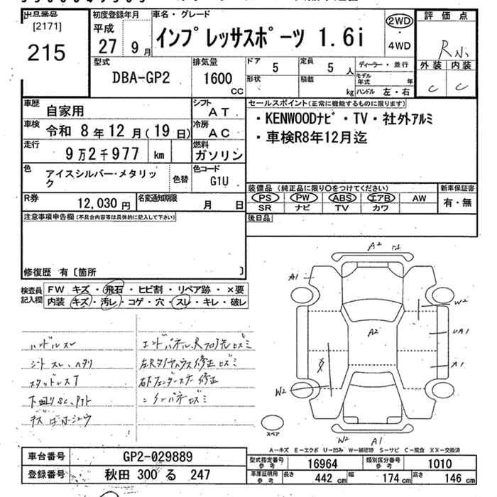 SUBARU IMPREZA SPORT 2015 г., лот № 215