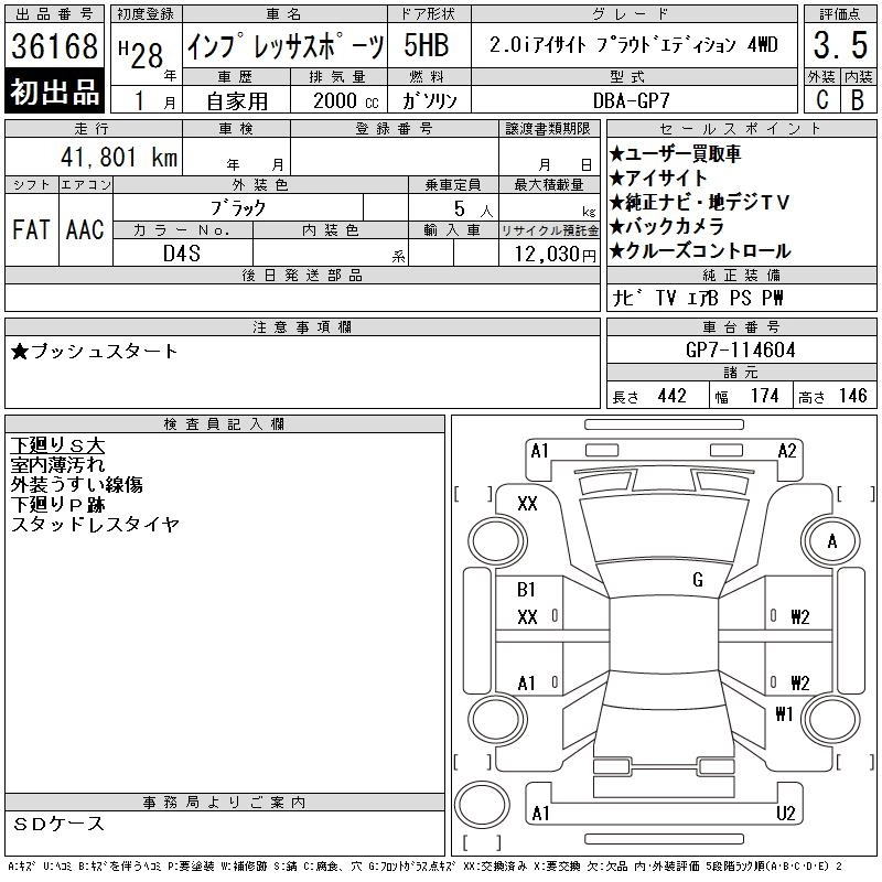 SUBARU IMPREZA SPORT 2016 г., лот № 36168