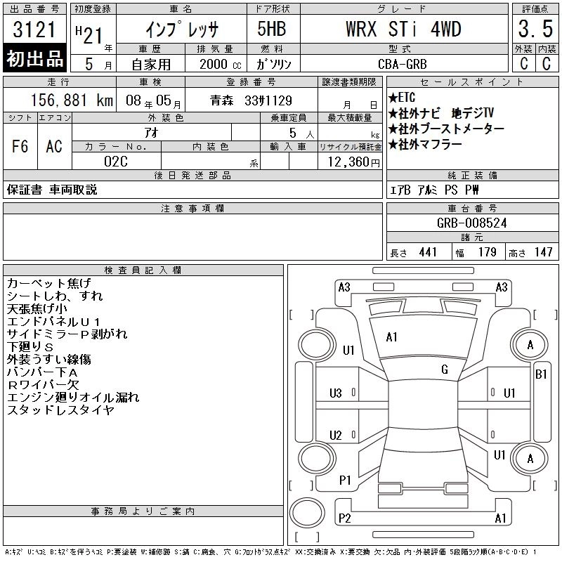 | WRX STI A LINE | CBA-GRF | EJ25 | Full-time 4WD | 5AT | 2457cc | 300ps(221kW)/6200rpm | AИ-95 | 3 150 000 |