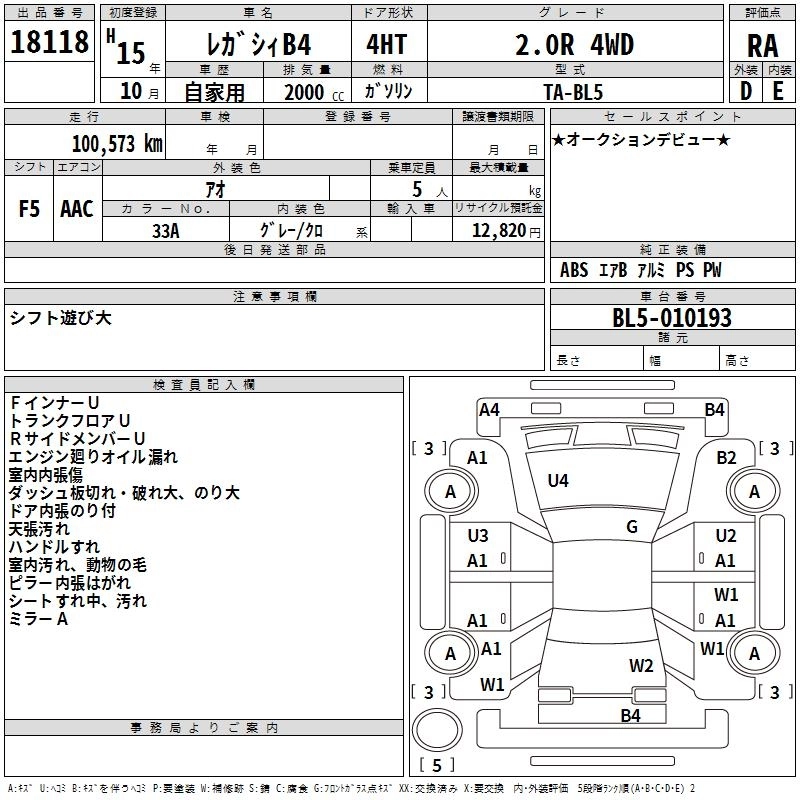 | BLITZEN 2003 MODEL | TA-BE5 | EJ20 | Full-time 4WD | 4AT | 1994cc | 260ps(191kW)/6000rpm | AИ-95 | 3 235 000 | |