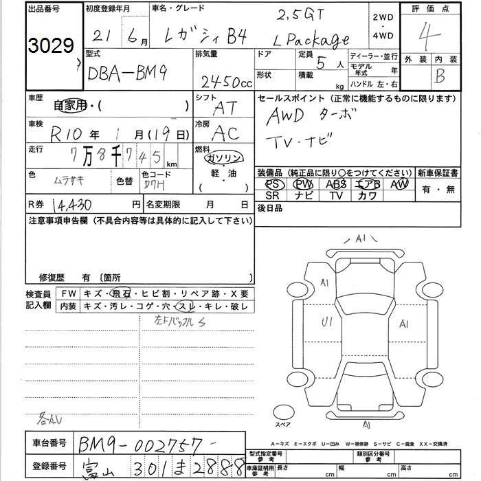 | 2.5GT SI CRUISE | DBA-BM9 | EJ25 | Full-time 4WD | 5AT | 2457cc | 285ps(210kW)/6000rpm | AИ-95 | 3 286 500 | |