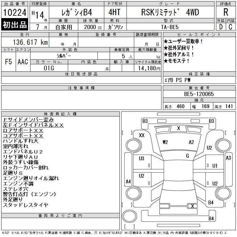 | RSK LIMITED | TA-BE5 | EJ20 | Full-time 4WD | 4AT | 1994cc | 260ps(191kW)/6000rpm | AИ-95 | 2 593 000 | |