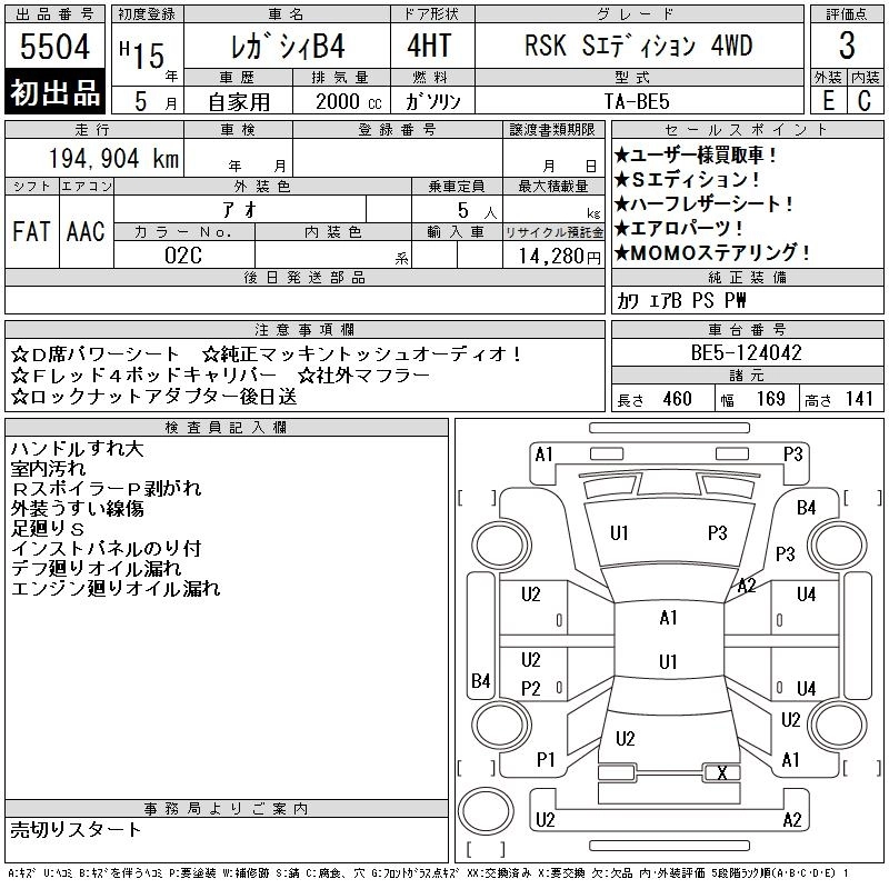 | BLITZEN 2003 MODEL | TA-BE5 | EJ20 | Full-time 4WD | 4AT | 1994cc | 260ps(191kW)/6000rpm | AИ-95 | 3 235 000 | |