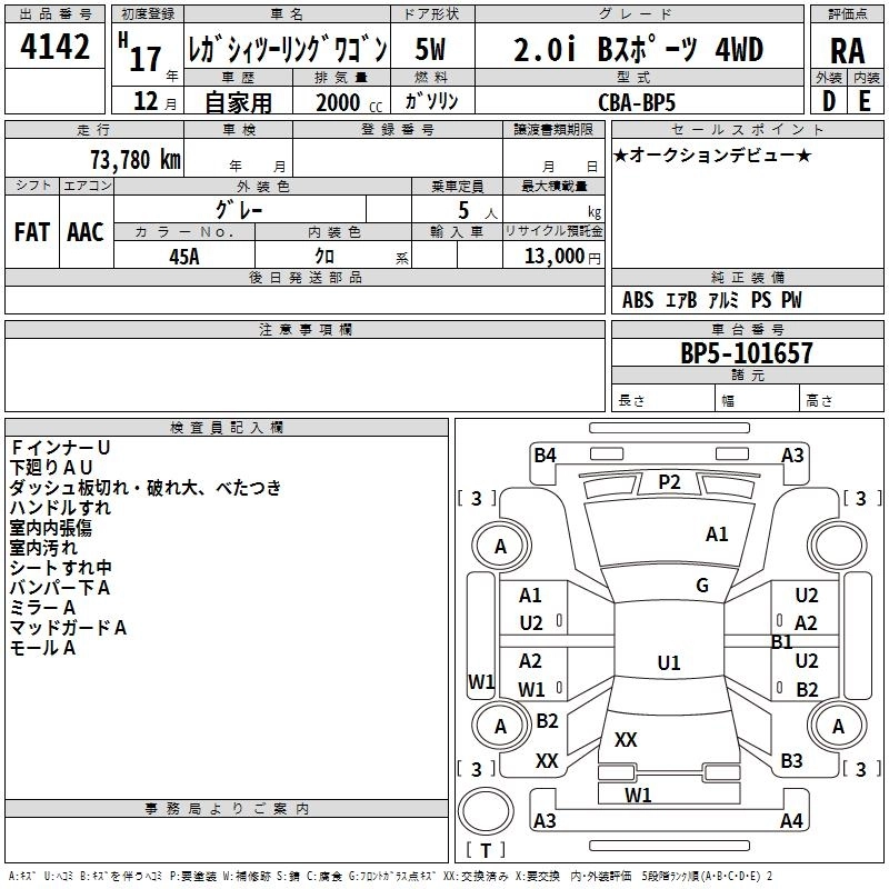 | 2.0I B SPORT BLACK INTERIOR SELECTION | CBA-BP5 | EJ20 | Full-time 4WD | 4AT | 1994cc | 140ps(103kW)/5600rpm | AИ-92 | 2 430 750 |