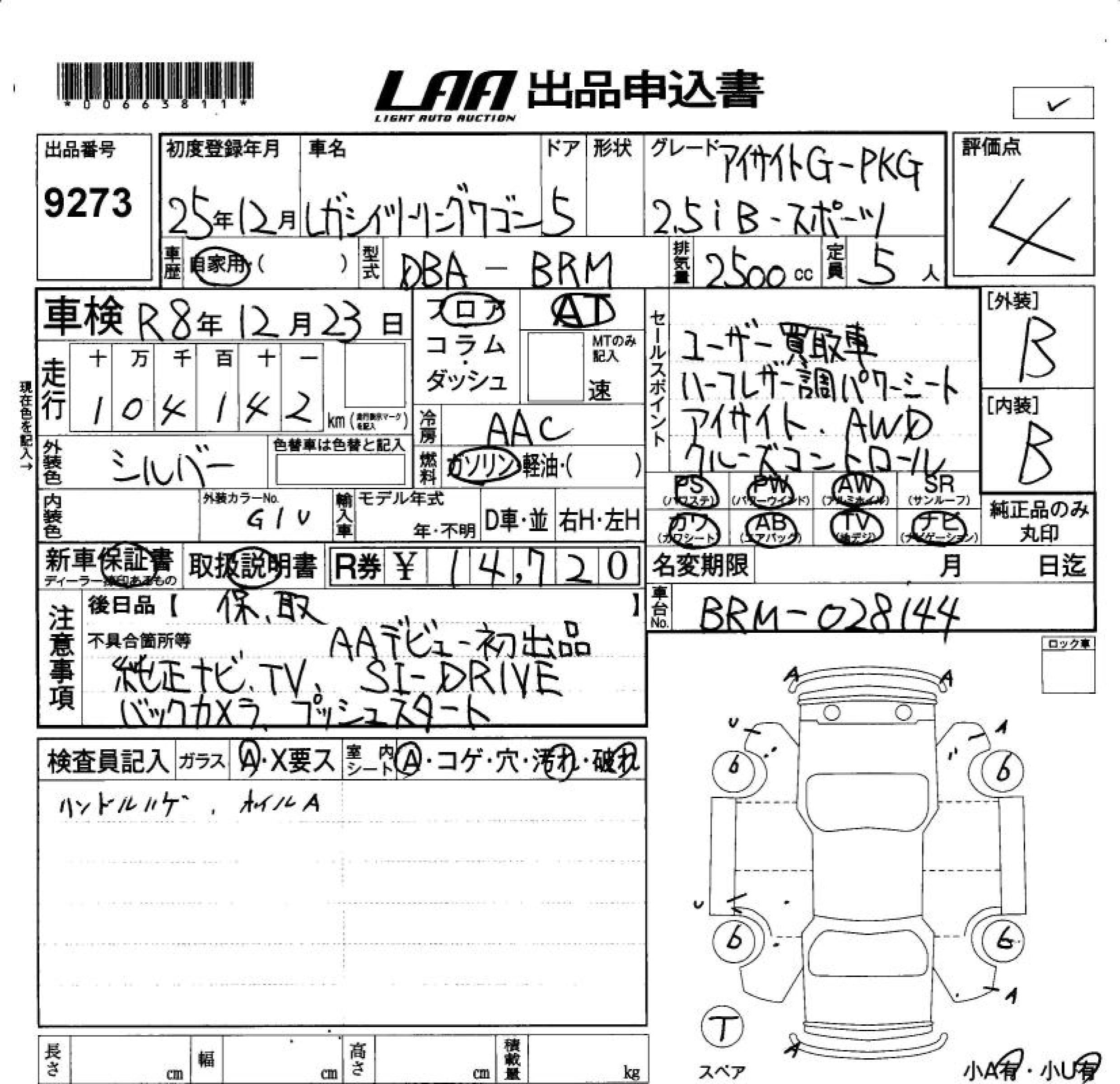 | 2.5I B SPORT EYE SIGHT S PACKAGE | DBA-BRM | FB25 | Full-time 4WD | CVT | 2498cc | 173ps(127kW)/5600rpm | AИ-92 | 2 782 500 | |