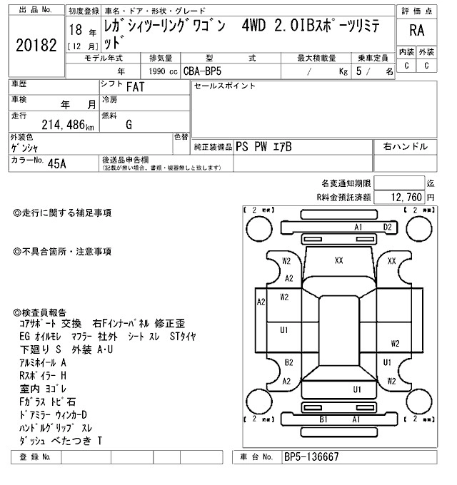 | TUNED BY STI | CBA-BP5 | EJ20 | Full-time 4WD | 5AT | 1994cc | 260ps(191kW)/6000rpm | AИ-95 | 4 116 000 |