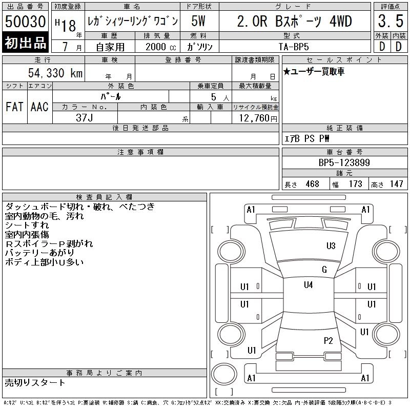 2.0I CASUAL EDITION CBA-BP5 EJ20 Full-time 4WD 4AT 1994cc 140ps(103kW)/5600rpm AИ-92 2 152 500