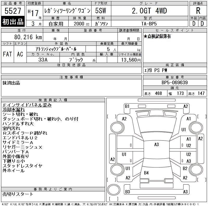 | 2.0GT WR-LIMITED 2005 | TA-BP5 | EJ20 | Full-time 4WD | 5AT | 1994cc | 260ps(191kW)/6000rpm | AИ-95 | 3 276 000 |