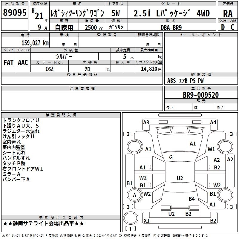 | 2.5GT SI CRUISE | DBA-BR9 | EJ25 | Full-time 4WD | 5AT | 2457cc | 285ps(210kW)/6000rpm | AИ-95 | 3 438 750 | |