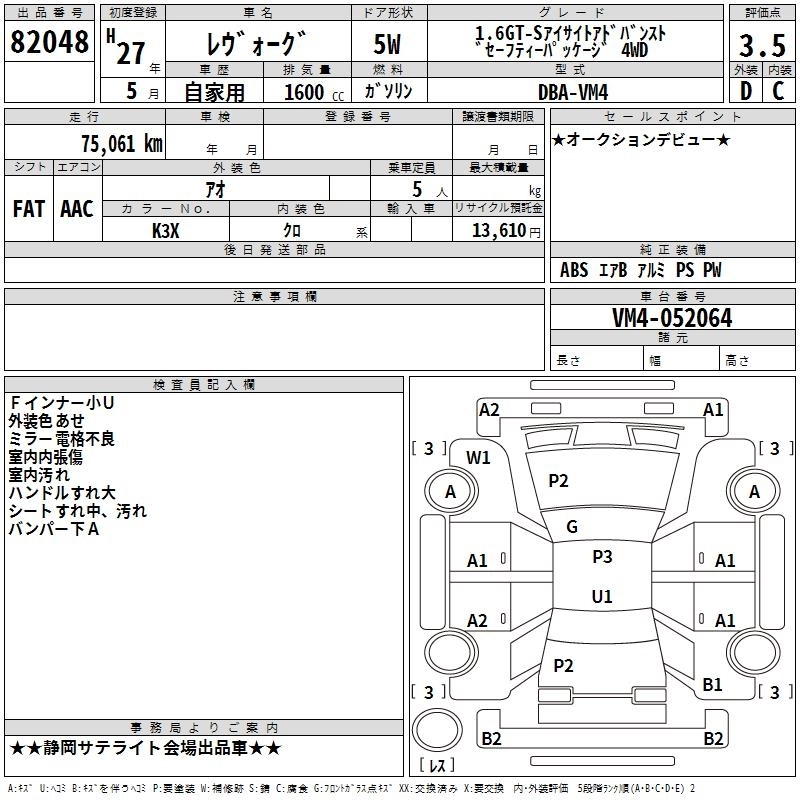 1.6GT-S EYE SIGHT DBA-VM4 FB16 Full-time 4WD CVT 1599cc 170ps(125kW)/4800~5600rpm AИ-92 3 056 400