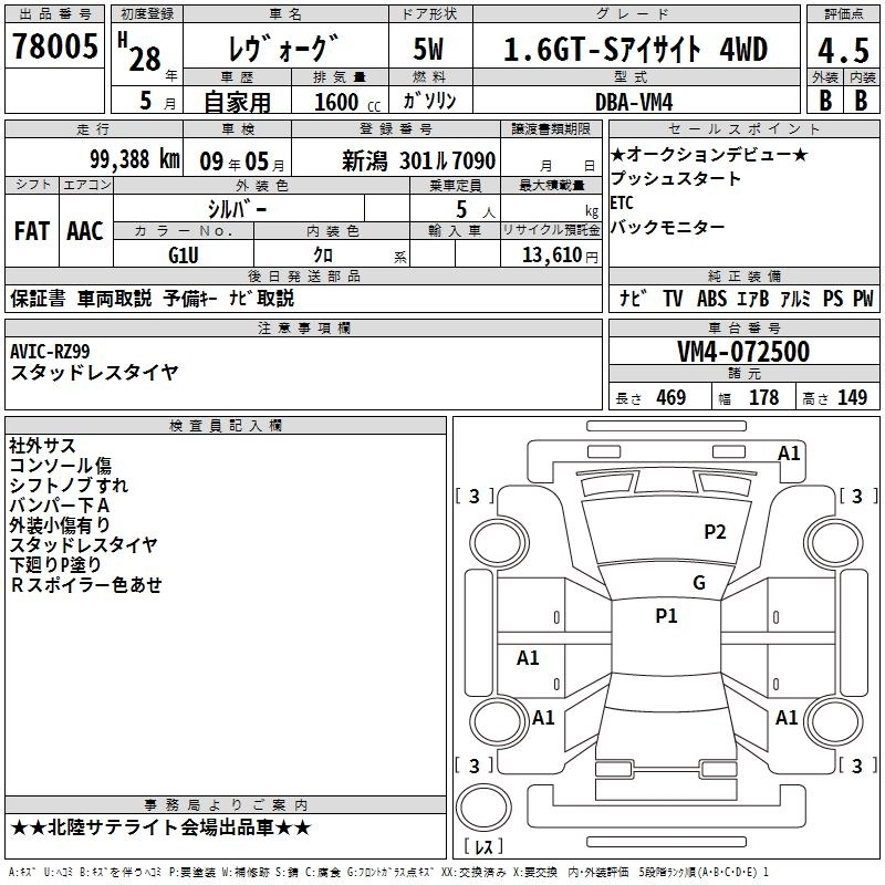 | 1.6GT EYE SIGHT S STYLE | DBA-VM4 | FB16 | Full-time 4WD | CVT | 1599cc | 170ps(125kW)/4800~5600rpm | AИ-92 | 2 905 200 | |