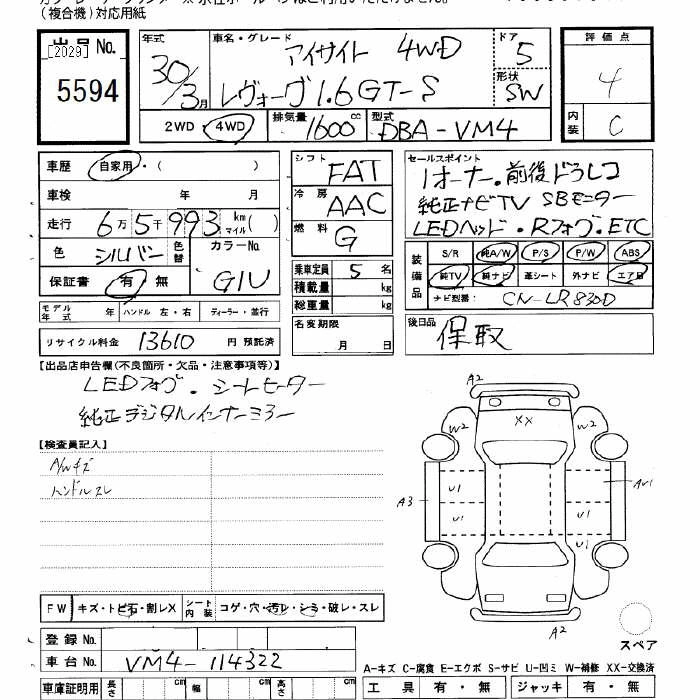 | 1.6GT EYE SIGHT SMART EDITION | DBA-VM4 | FB16 | Full-time 4WD | CVT | 1599cc | 170ps(125kW)/4800~5600rpm | AИ-92 | 2 948 400 | |