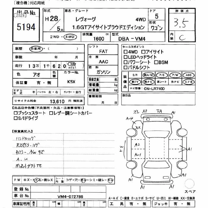 | 1.6GT EYE SIGHT SMART EDITION | DBA-VM4 | FB16 | Full-time 4WD | CVT | 1599cc | 170ps(125kW)/4800~5600rpm | AИ-92 | 2 905 200 |