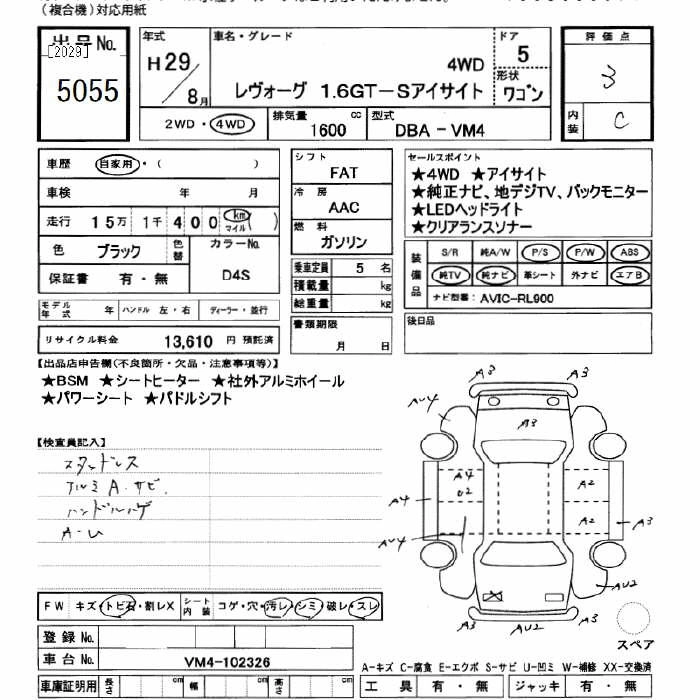1.6GT-S EYE SIGHT DBA-VM4 FB16 Full-time 4WD CVT 1599cc 170ps(125kW)/4800~5600rpm AИ-92 3 078 000