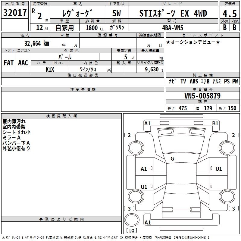| STI SPORT EX | 4BA-VN5 | CB18 | Full-time 4WD | CVT | 1795cc | 177ps(130kW)/5200~5600rpm | AИ-92 | 4 092 000 | |