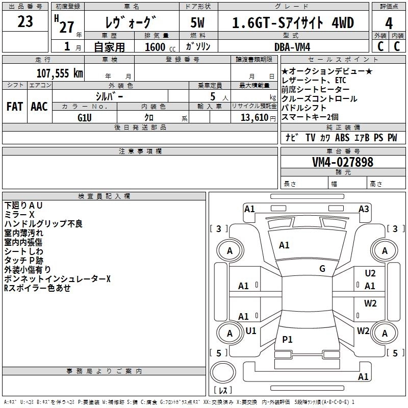 1.6GT EYE SIGHT PROUD EDITION DBA-VM4 FB16 Full-time 4WD CVT 1599cc 170ps(125kW)/4800~5600rpm AИ-92 2 862 000
