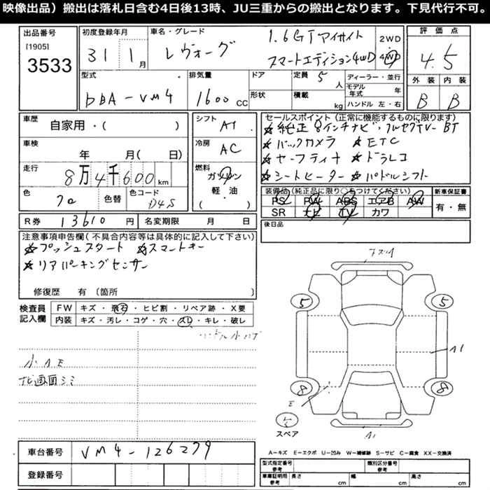 | 1.6GT EYE SIGHT SMART EDITION | DBA-VM4 | FB16 | Full-time 4WD | CVT | 1599cc | 170ps(125kW)/4800~5600rpm | AИ-92 | 2 948 400 | |