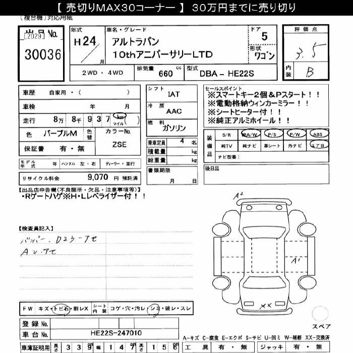 | X | DBA-HE22S | K6A | FF | CVT | 658cc | 54ps(40kW)/6500rpm | AИ-92 | 1 266 300 | |