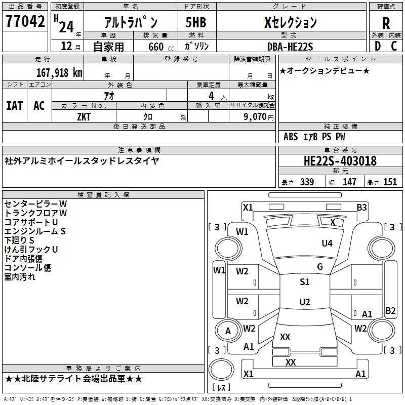 | X | DBA-HE22S | K6A | FF | CVT | 658cc | 54ps(40kW)/6500rpm | AИ-92 | 1 222 200 | |