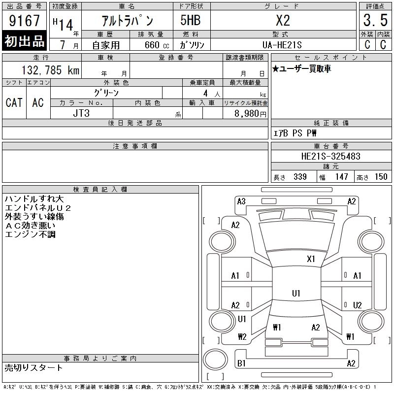 | X | UA-HE21S | K6A | FF | 4AT | 658cc | 54ps(40kW)/6500rpm | AИ-92 | 1 068 000 |