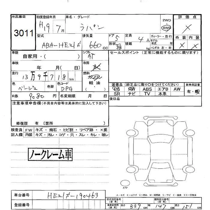 | MODE | ABA-HE21S | K6A | FF | 4AT | 658cc | 64ps(47kW)/6500rpm | AИ-92 | 1 240 050 | |