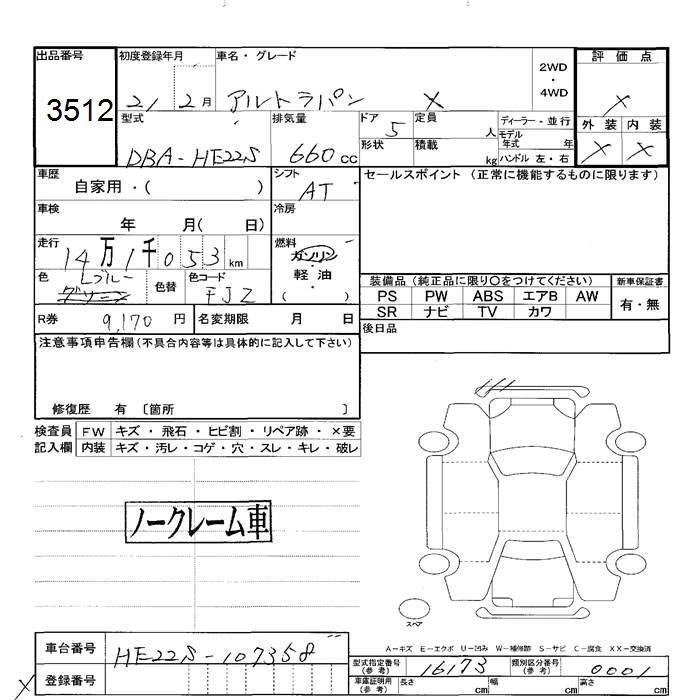 | X | DBA-HE22S | K6A | FF | CVT | 658cc | 54ps(40kW)/6500rpm | AИ-92 | 1 222 200 | |
