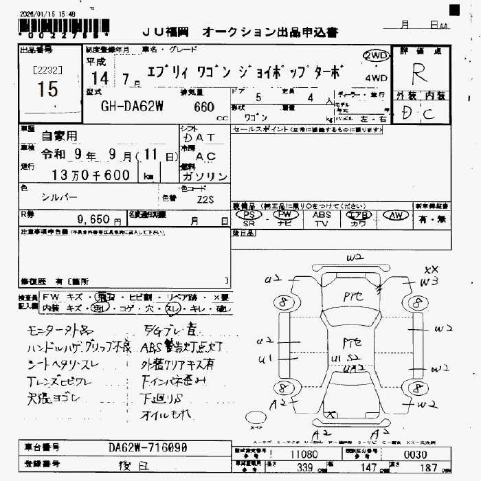 | PC | LE-DA62V | K6A | Part-time 4WD | 5MT | 658cc | 49ps(36kW)/5800rpm | AИ-92 | 1 028 000 | |