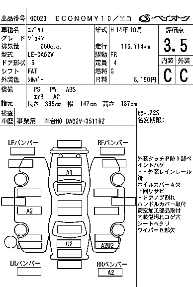 | PC | LE-DA62V | K6A | Part-time 4WD | 5MT | 658cc | 49ps(36kW)/5800rpm | AИ-92 | 1 028 000 | |