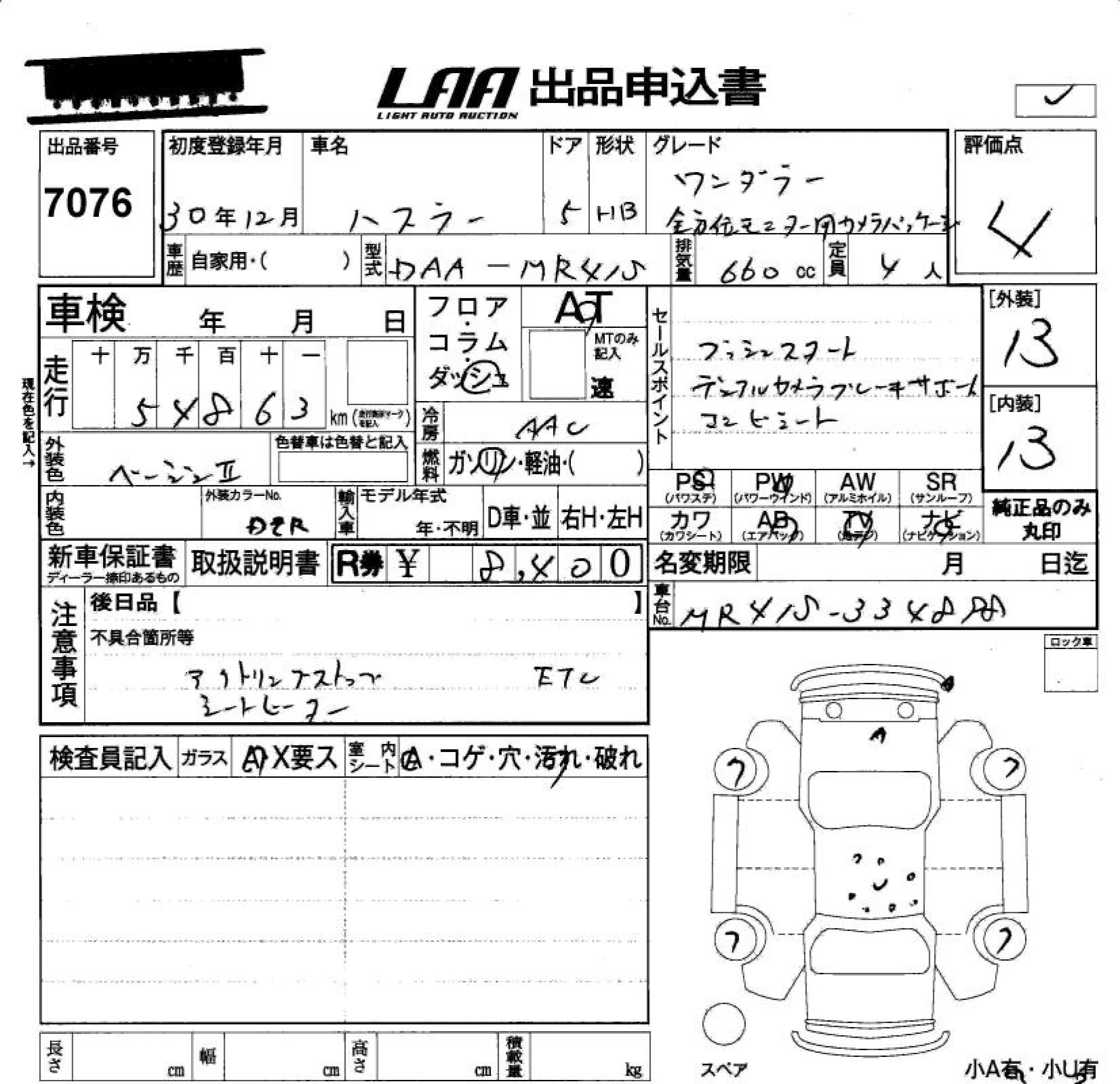 | A | DBA-MR31S | R06A | FF | 5MT | 658cc | 52ps(38kW)/6500rpm | AИ-92 | 1 100 520 |