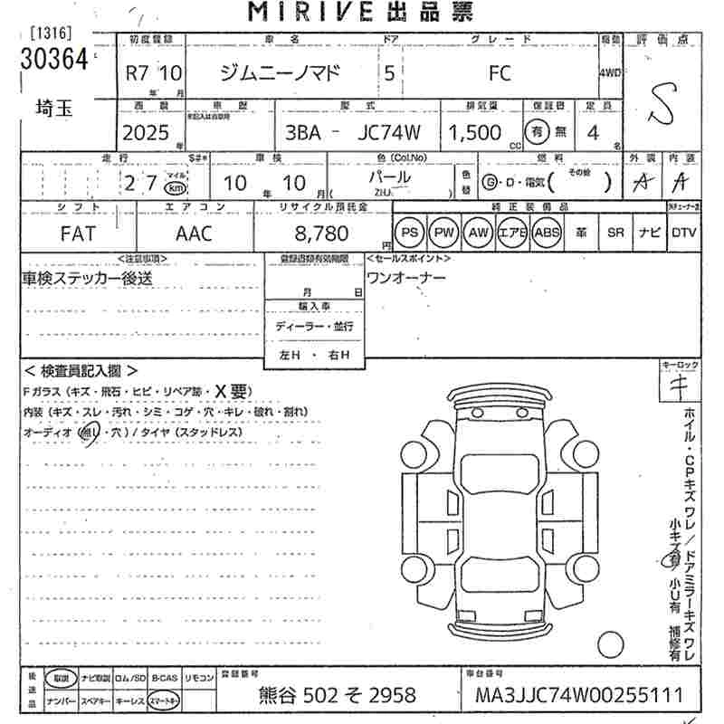 Статус выставлен на аукцион Лот 30364 Аукцион MIRIVE Saitama Дата аукциона 04.02.2026