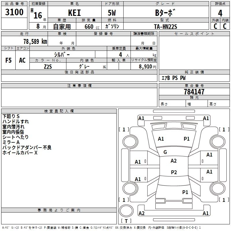 | A | CBA-HN22S | K6A | FF | 4AT | 658cc | 54ps(40kW)/6500rpm | AИ-92 | 838 950 | |