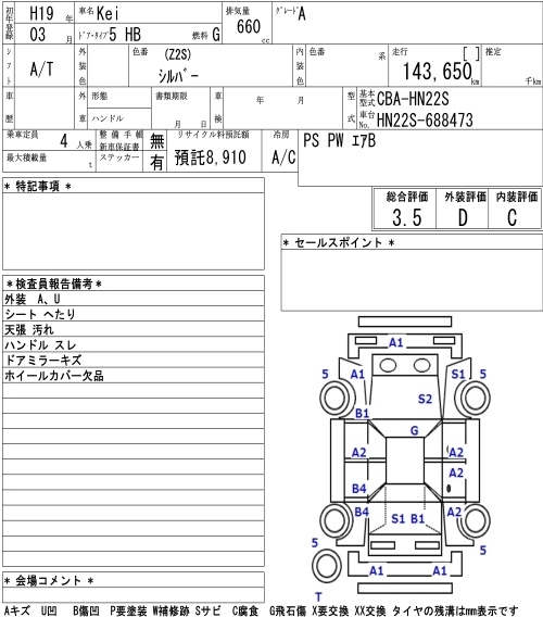 | A | CBA-HN22S | K6A | FF | 4AT | 658cc | 54ps(40kW)/6500rpm | AИ-92 | 861 000 | |