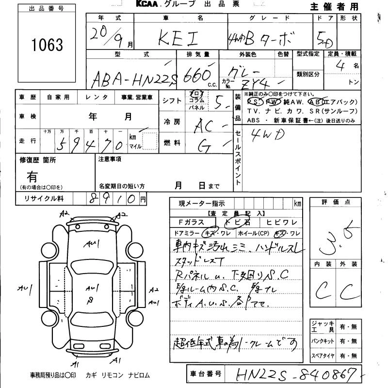 | A | CBA-HN22S | K6A | FF | 4AT | 658cc | 54ps(40kW)/6500rpm | AИ-92 | 861 000 | |