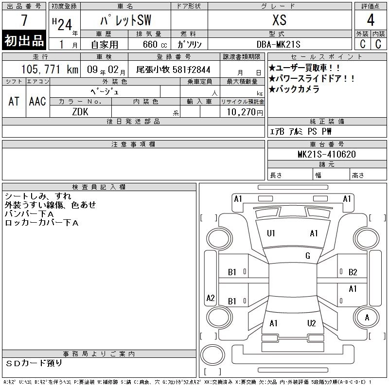 | XS IDLING STOP | DBA-MK21S | K6A | FF | CVT | 658cc | 54ps(40kW)/6500rpm | AИ-92 | 1 522 500 | |