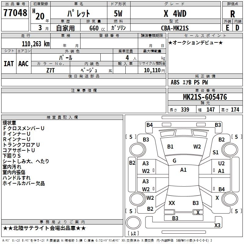 | XS | DBA-MK21S | K6A | FF | 4AT | 658cc | 54ps(40kW)/6500rpm | AИ-92 | 1 365 000 | |