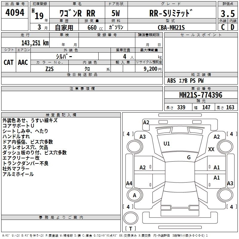 | RR-S LIMITED | CBA-MH22S | K6A | Full-time 4WD | 4AT | 658cc | 60ps(44kW)/6000rpm | AИ-92 | 1 393 350 | |