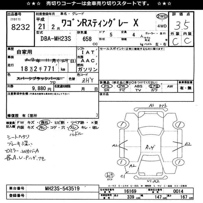 | TS | CBA-MH23S | K6A | FF | CVT | 658cc | 64ps(47kW)/6000rpm | AИ-92 | 1 554 000 | |