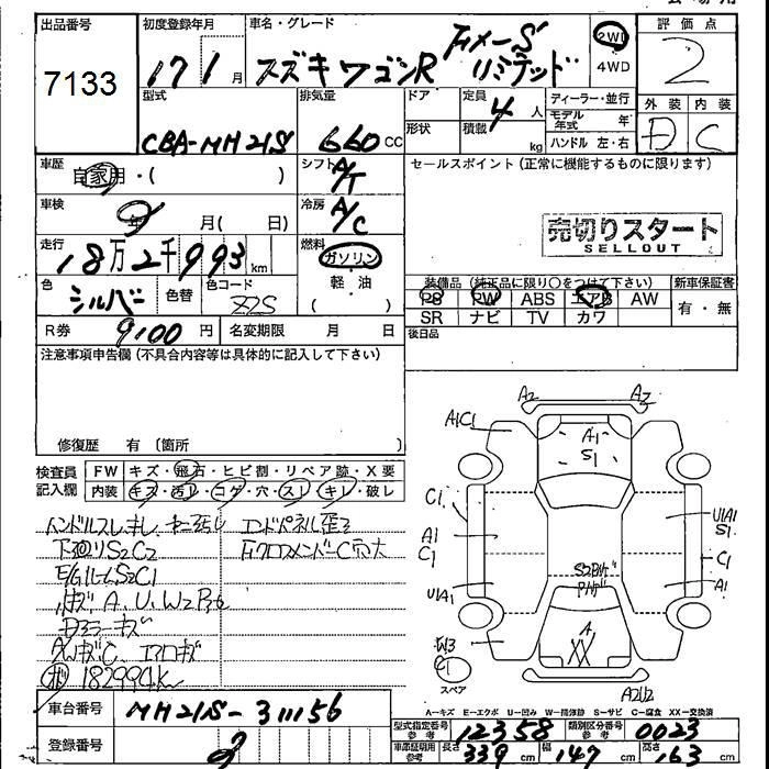 | FX-S LIMITED | DBA-MH21S | K6A | Full-time 4WD | 4AT | 658cc | 54ps(40kW)/6500rpm | AИ-92 | 1 193 850 | |