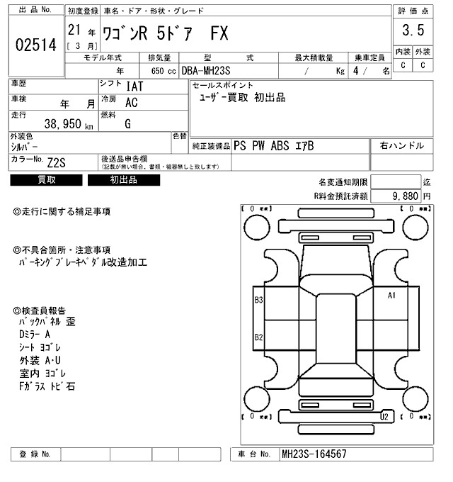 | FX | DBA-MH23S | K6A | Full-time 4WD | 5MT | 658cc | 54ps(40kW)/6500rpm | AИ-92 | 1 162 350 | |