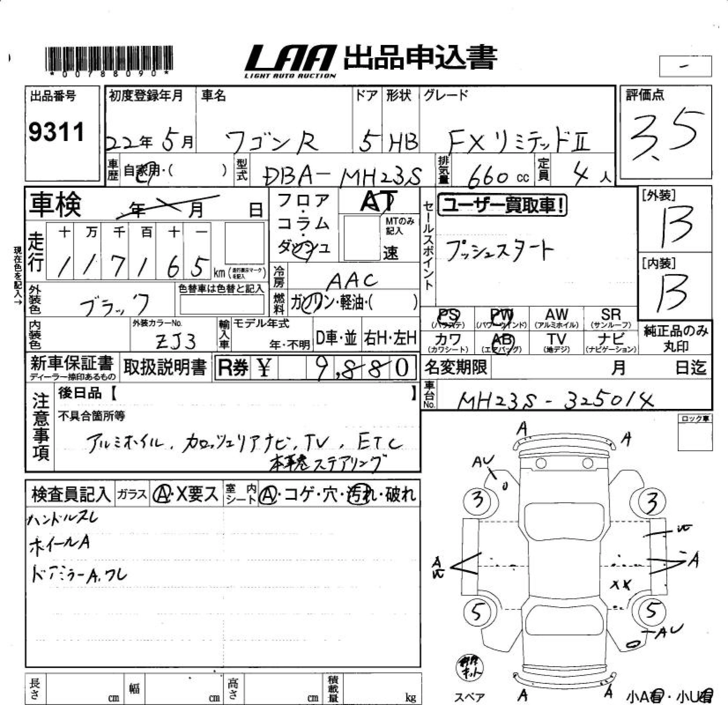 | FX LIMITED | DBA-MH23S | K6A | FF | 4AT | 658cc | 54ps(40kW)/6500rpm | AИ-92 | 1 181 250 | |